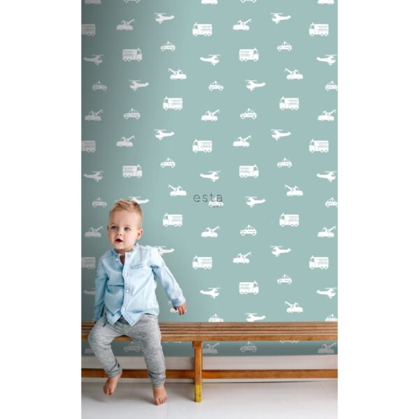 Esta home behang met brandweer/auto/helikopter/kranen licht blauw