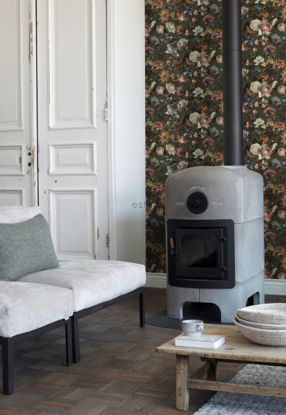 Esta behang Paradise met bloemen vergrijsd olijfgroen