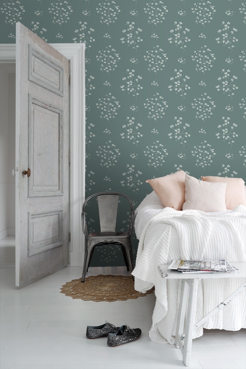 Esta Blush behang met bloesemtakken petrolgroen