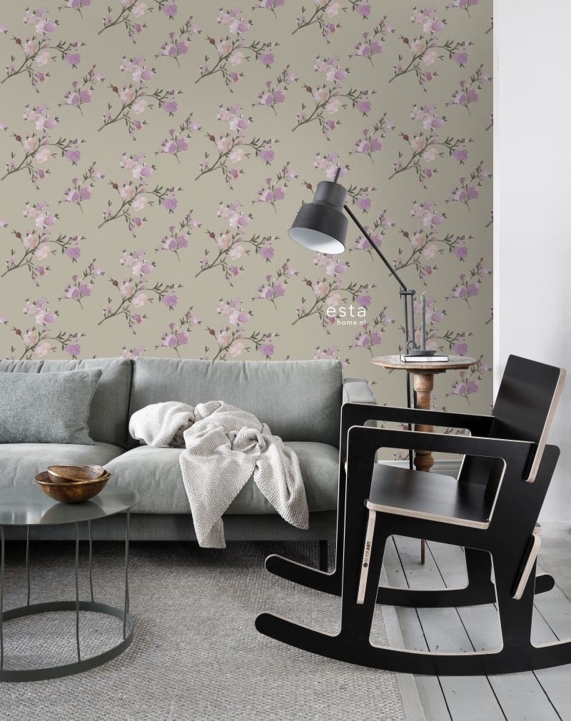 Esta Blush behang met kersenbloesem taupe/lila 148717