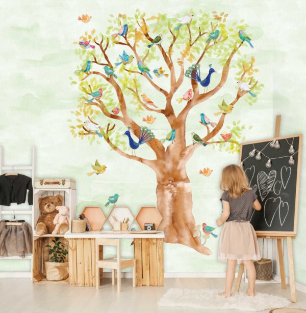 Fotobehang Birds in Trees Green/Vogels/Boom/Kinderkamer Behang