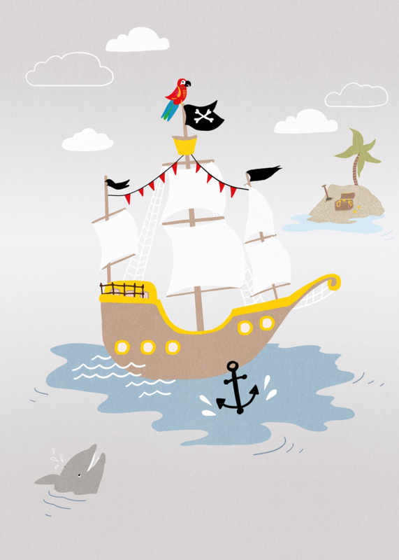 Fotobehang Pirates Grey/Piratenschip/Zee/Rovers/Papegaai/Kinderkamer Behang