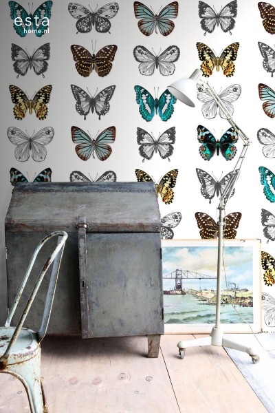 Greenhouse behang van Esta met veertjes,mint,creme,beige