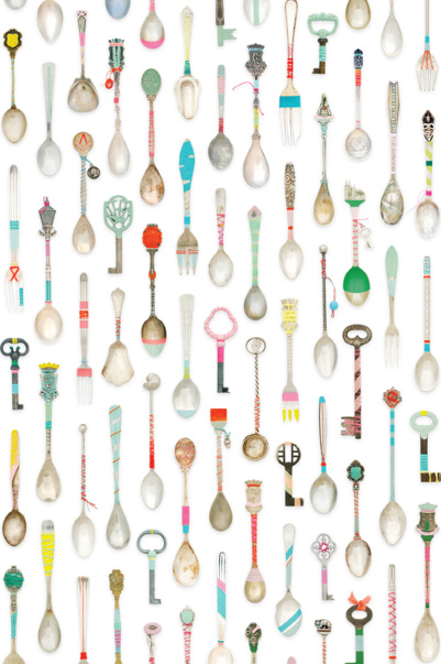 Theelepeltjes, vorkjes en oude sleutels van vergeten kamers, met hier en daar een likje verf sieren dit behang